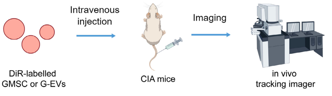 类风湿关节炎(Rheumatoid arthritis,RA)是一种慢性自身免疫性疾病,以滑膜炎症、软骨破坏和骨侵蚀为特征,最终导致关节功能丧失。间充质干细胞(MSCs)因免疫调节和组织修复能力被视为RA治疗的潜在候选,但临床转化面临被肺部截留和关节生理屏障阻碍两大瓶颈。细胞外囊泡(EVs)作为MSCs 的无细胞衍生物,具有易穿透生物屏障、低免疫原性、无细胞异常分化风险等优势,且能保留供体细胞的免疫调节功能。但EVs如何精准靶向RA 炎症关节的分子机制尚未明确,尤其是趋化因子受体在这一过程中的作用有待阐明。本研究旨在比较GMSCs与GMSC-EVs在RA动物模型中的体内分布和治疗效果,同时鉴定介导 GMSC-EVs向炎症关节归巢的关键趋化因子受体,为开发基于CCR2工程化的EVs疗法奠定基础。