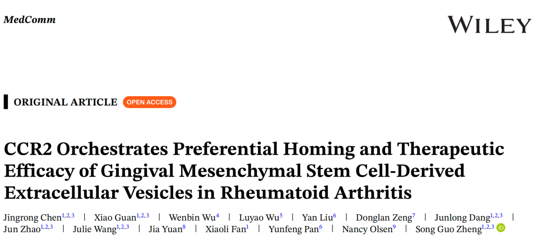 近期,来自上海交通大学医学院附属松江医院的郑颂国教授和范小利教授团队在Medcomm杂志发表了题为“CCR2 Orchestrates Preferential Homing and Therapeutic Efficacy of Gingival Mesenchymal Stem Cell‐Derived Extracellular Vesicles in Rheumatoid Arthritis”的科研论文,IF=10.7。