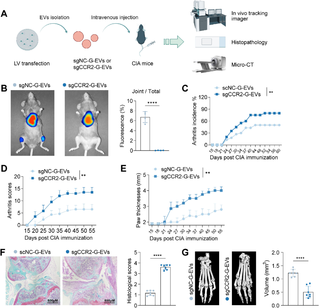 在本研究中,作者首先用本公司的试剂盒提取纯化了人牙龈间充质干细胞来源的外泌体(GMSC-EVs),并通过透射电镜(TEM)、纳米颗粒追踪分析(NTA)和蛋白质印迹分析(WB)进行了鉴定。结果发现电镜符合外泌体的茶托型结构,粒径大小是145 nm,标志物CD63、CD81、CD9和TSG101表达较高。接着作者比较了GMSC和GMSC-EVs的免疫调节功能,结果发现GMSC-EVs与GMSCs均能抑制T细胞增殖和TNF-α分泌,调节T细胞炎症相关基因表达,且GMSC-EVs抑制T细胞增殖的能力更显著,表明其保留了供体细胞的免疫调节特性。为了评估GMSC及GMSC-EVs在RA中的治疗潜力,作者构建了胶原诱导的DBA/1J 小鼠关节炎(CIA) 模型。结果发现GMSC-EVs能显著减轻小鼠关节肿胀、降低关节炎的总发病率,减少关节滑膜增生、软骨侵蚀和骨质破坏,其效果优于GMSCs。在免疫调节方面,GMSC-EVs降低引流淋巴结中致病性Th17细胞比例,升高调节性T细胞和抗炎细胞因子IL-10水平,同时抑制血清中TNF-α、IFN-γ、抗胶原Ⅱ抗体的表达。为了直接比较GMSC与GMSC-EVs的体内生物分布和炎症靶向能力,作者进行了CIA小鼠模型活体成像。结果发现GMSC-EVs 静脉注射后主要富集于CIA小鼠的炎症关节,而GMSCs主要被肺和肝脏截留,关节中几乎无富集。为了验证发炎的关节存在一种独特的生理屏障(阻碍GMSC进入,但允许GMSC-EVs进入),作者构建了xGvHD小鼠模型,结果发现GMSC-EVs仍能向关节富集,其归巢能力依赖自身特性,而非仅依赖炎症趋化信号。为了系统地识别GMSC-EVs的靶向受体,作者进行了蛋白组学分析,结果发现趋化因子受体(CCR2)在GMSC-EVs上显著富集,且高于其他趋化因子受体(CCR5、CXCR4),而在GMSCs中表达较低;CCR2通过与RA滑膜中高表达的配体CCL2结合实现靶向富集。为了测试GMSC-EVs在靶向归巢至关节炎方面发挥着关键作用,作者使用CRISPR-Cas9系统生成了CCR2敲低的GMSC,并提取了CCR2敲低GMSC-EVs进行实验,结果发现GMSC-EVs 向炎症关节的归巢能力几乎完全丧失,同时其改善RA症状、保护关节组织、调节免疫平衡的治疗效果也彻底丧失。